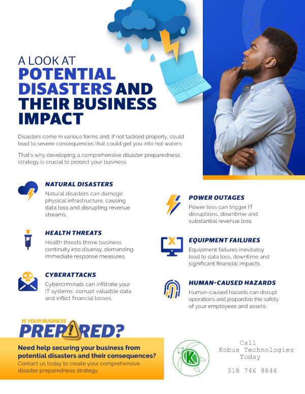 Disasters come unexpectedly and in all sizes. A natural disaster, like an earthquake or flood, can devastate your business and cause immense financial and physical loss, while even a simple coffee spill can disrupt business operations.